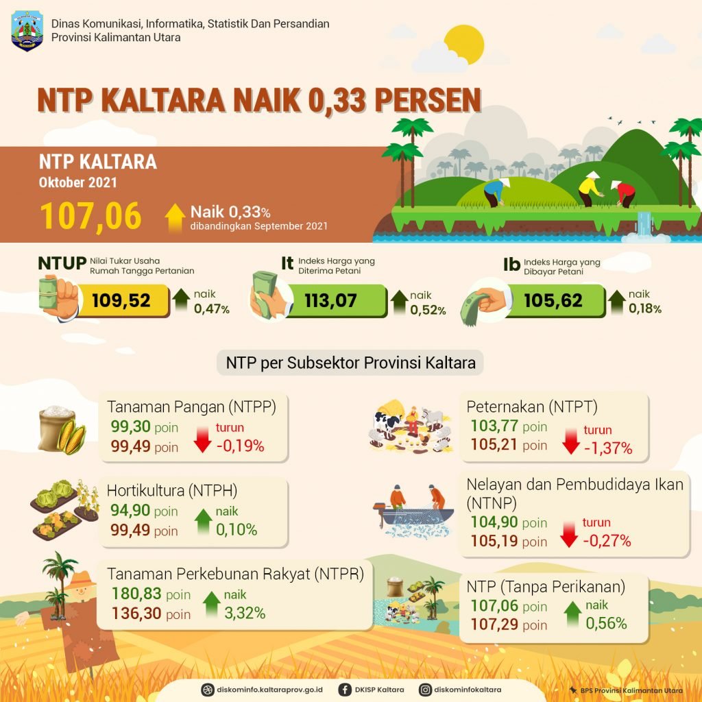 TANJUNG SELOR – Nilai Tukar Petani (NTP) Provinsi Kalimantan Utara pada bulan Oktober 2021 kembali naik sebesar 0,33 persen terhadap bulan sebelumnya. NTP Kaltara di bulan September berada pada posisi 106,71 namun pada bulan Oktober 2021 mengalami kenaikkan sebesar 107,06.