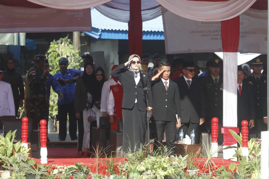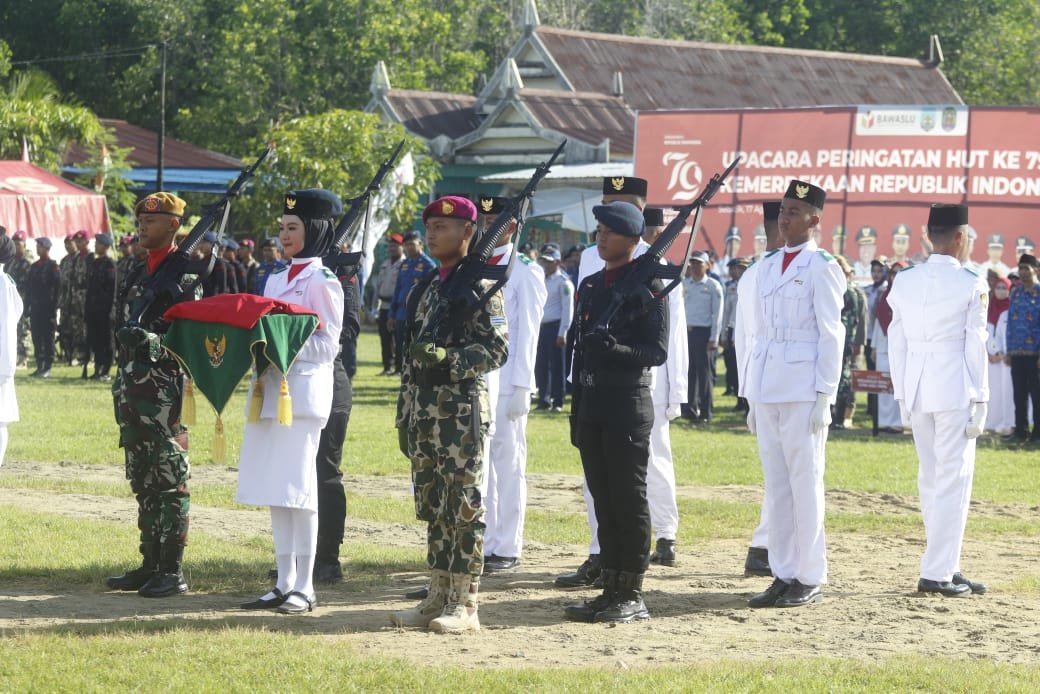 Sebelum Apel Siaga Pengawasan Partisipatif, Lolly Suhenty juga sebagai pembina upacara Hari Ulang Tahun Republik Indonesia yang ke-79 dilaksanakan di tempat yang sama.(BAWASLU)