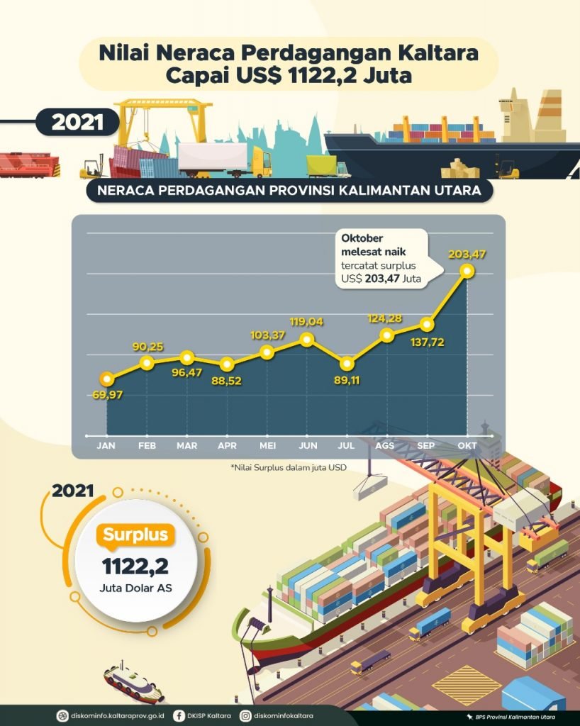 Namun menurutnya, memasuki bulan Agustus neraca perdagangan Kaltara kembali naik tercatat surplus sebesar US$ 124,28 Juta dengan total ekspor mencapai US$ 137,55 Juta dan total impor mencapai US$ 13,27 Juta. Demikian pula September kembali melesat naik tercatat surplus sebesar US$ 137,72 Juta dengan total ekspor sebesar US$ 156,96 Juta dan total impor sebesar US$ 19,24 Juta. Dan total nilai neraca perdagangan Kaltara selama tahun 2021 mencapai US$ 1122,2 Juta. (
