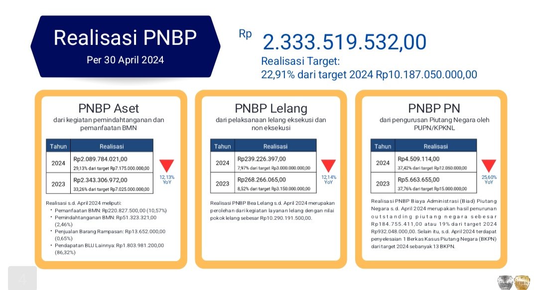 Tarakan – Kantor Pelayanan Kekayaan Negara dan Lelang (KPKNL) Tarakan turut berkontribusi dalam menghasilkan Penerimaan Negara Bukan Pajak (PNBP) yang berasal dari kegiatan pengelolaan Barang Milik Negara (BMN), pelayanan lelang, dan pengurusan Piutang Negara di wilayah Provinsi Kalimantan Utara. Sampai dengan bulan April 2024, KPKNL Tarakan telah menghasilkan PNBP sebesar Rp2,3 Miliar atau setara 22,91% dari target total PNBP KPKNL Tarakan tahun 2024.