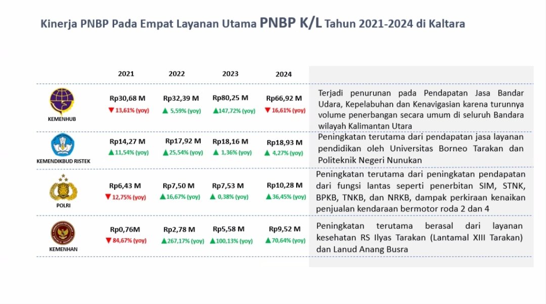Penerimaan negara yang dihasilkan KPKNL Tarakan selama Januari s.d. April 2024 didominasi oleh PNBP pengelolaan BMN yang mencapai Rp2,1 Miliar, dengan nilai terbesar dihasilkan dari pengelolaan BMN Badan Layanan Umum (BLU) UPBU Juwata senilai Rp1,8 Miliar. Untuk pelaksanaan lelang, PNBP berupa bea lelang sebesar Rp239 Juta. Nilai tersebut diperoleh dari kegiatan layanan lelang dengan nilai pokok lelang sebesar Rp10,3 Miliar. Sedangkan di bidang Piutang Negara, sampai dengan bulan April 2024, KPKNL Tarakan mampu melaksanakan pengurusan Piutang Negara dengan baik, yang dibuktikan dengan penurunan outstanding Piutang Negara sebesar Rp184 Juta serta menghasilkan PNBP senilai Rp4,5 Juta.