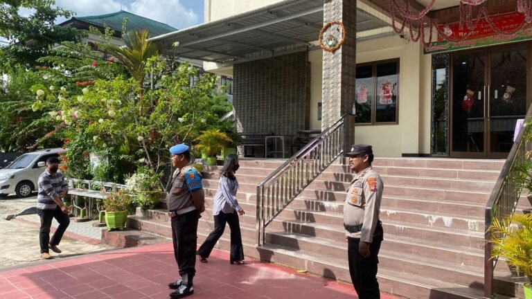 TARAKAN – sejumlah personel Polres Tarakan terlihat berjaga di sekitar beberapa gereja di kota Tarakan. Kehadiran polisi ini bertujuan untuk memberikan rasa aman kepada jemaat yang hendak melaksanakan ibadah, sekaligus mencegah potensi gangguan keamanan yang mungkin timbul menjelang perayaan Natal dan tahun baru.
