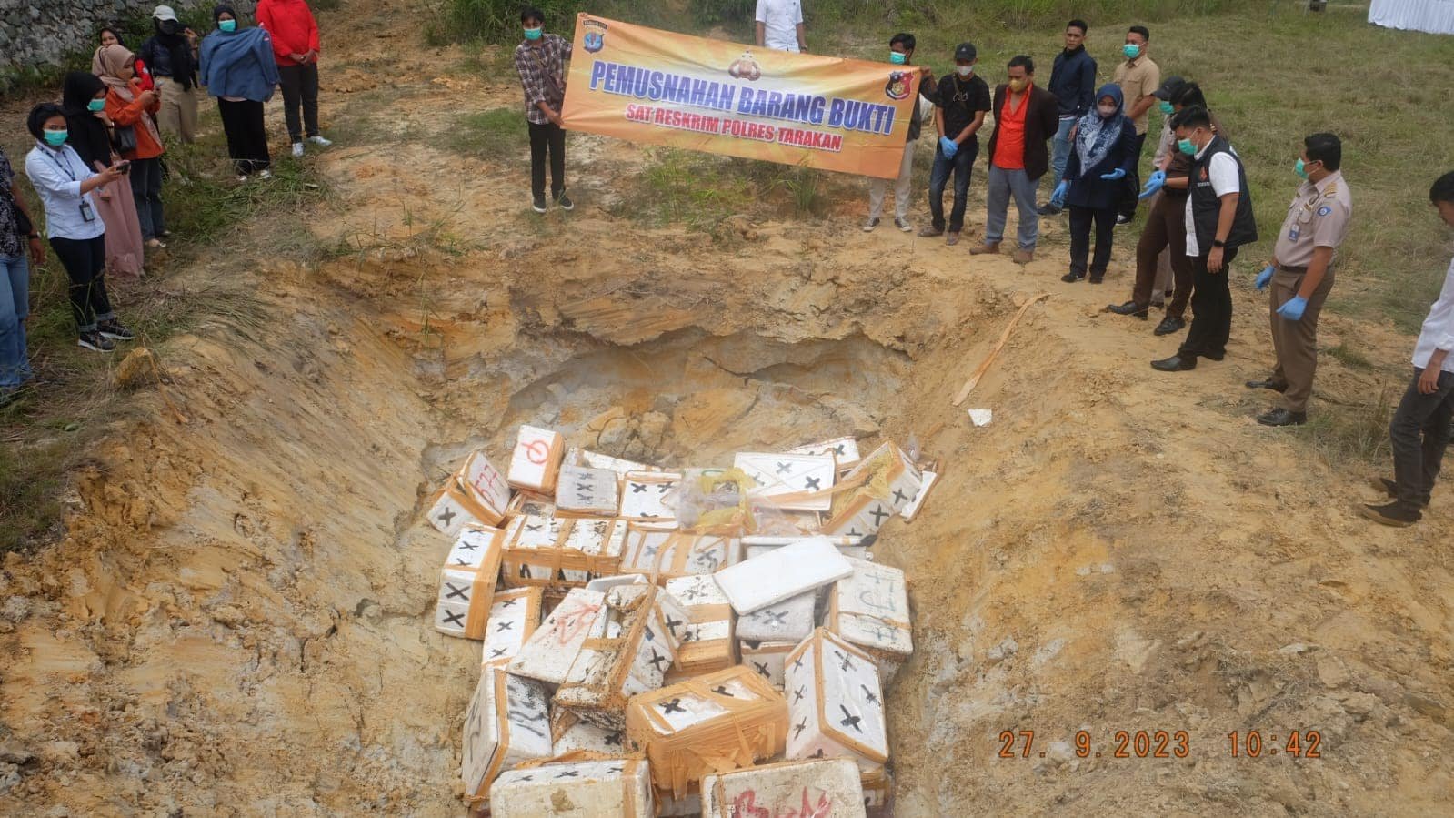 Kapolres Tarakan AKBP Ronaldo Maradona T.P.P Siregar S.H., S.I.K Melalui Kasat Reskrim AKP Randhya Sakthika Putra, S.Tr.K.,S.I.K, menjelaskan barang bukti yang dimusnakan hari ini merupakan barang bukti dari pengungkapan kasus oleh unit tindak pidanan tertentu sat reskrim polres tarakan, yang terjadi di Beringin 1 KEL.Selumit Pantai Kec Tarakan Tengah Kota Tarakan pada hari jumat (26/05/2023) lalu. Dalam pemusnahan barang bukti tersebut diahadiri oleh perwakilan dari Kejaksaan Negeri Tarakan, Perwakilan dari Pengadilan tarakan, dan juga perwakilan dari pengawasan sumber daya kelautan dan perikanan kota tarakan.