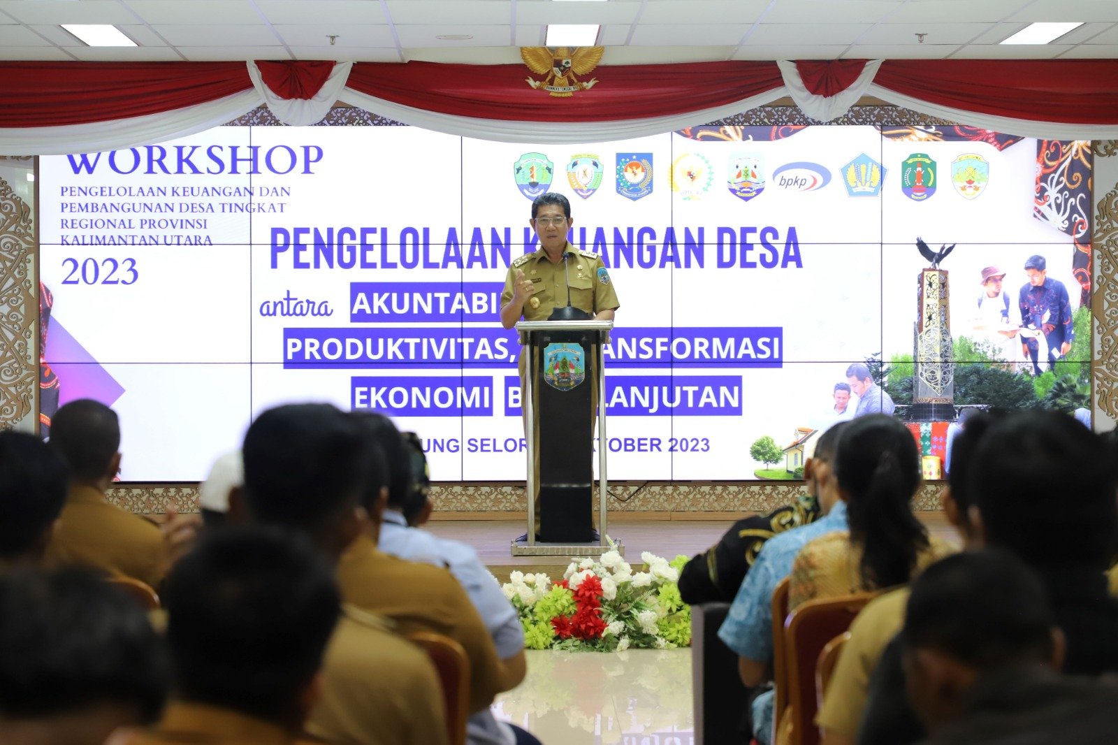 TANJUNG SELOR – Workshop Evaluasi Pengelolaan Keuangan dan Pembangunan Desa Tingkat Regional pada Provinsi Kalimantan Utara momentum penting untuk berdiskusi dalam mendukung peningkatan kesejahteraan masyarakat. Hal ini disampaikan Wakil Gubernur Kaltara, Dr Yansen TP, M.Si di Ruang Serbaguna Gedung Gadis, Selasa (10/10).