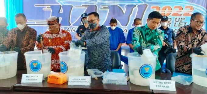 TARAKAN – Peringati Hari Anti Narkotika Internasional Badan Narkotika Nasional Provinsi (BNNP) Kaltara menggelar dan memsnahkan narkotika jenis sabu sebanyak 22,843.94 Kg. Pemusnahan ini dilakukan bersama unsur Forkopimda Kota Tarakan. pada Senin (27/6/2022) lalu.