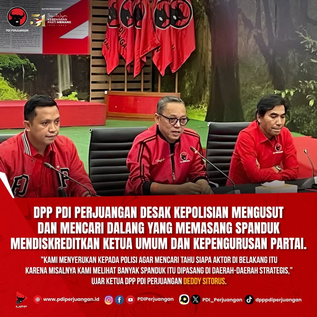 “Kami menyerukan kepada polisi agar mencari tahu siapa aktor di belakang itu karena kami melihat banyak spanduk itu dipasang di daerah-daerah strategis,” kata Ketua DPP PDI Perjuangan, Deddy Sitorus, dalam keterangan resmi, Selasa (24/12).